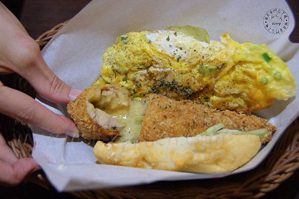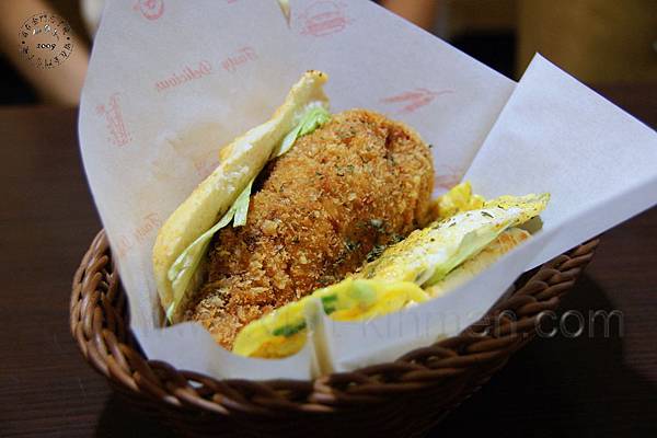 “八二三砲彈潛艇堡”,砲彈的部分是用雞腿去骨,塞入起司後,入鍋油炸。夾入生菜及香蔥煎蛋,就成了這個頗具特色的潛艇堡。一口咬下,爆漿出濃厚的起司香,與煎蛋、生菜超搭,這麼取名及選用材料搭配咬食時的效果,不但好吃,還兼具創意。